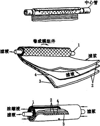 图1-14-42 管式膜组件 1-膜表面层 2-膜支撑层 3-玻璃纤维管 (3)卷式膜组件(图1-14-43) 将板式膜与支撑材料、隔网等相间重叠放置后卷绕起来即为卷式膜组件。该类组件单位体积内的膜表面积大,投资及运行费用低。但因流道过窄,流速难于调节,固体悬浮物会发生严重结垢,故仅限于超滤使用。