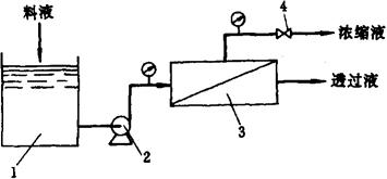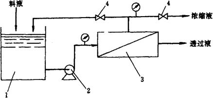 图1-14-45 一级一段连续式工艺流程图 1-料液贮槽 2-泵 3-膜组件 4-阀门 ②一级一段循环式(图1-14-46):原液流过组件后,将部分浓缩液返回料液贮槽1,与原有料液混合后再次通过膜组件进行分离。该流程提高了水的回收率,但水质有所下降。