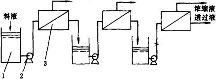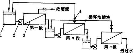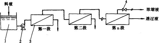 图1-14-46 一级一段循环式工艺流程图 1-料液贮槽 2-泵 3-膜组件 4-阀门 ③一级多段连续式(图1-14-47):把前一段的浓缩液作为后一段的进料液,而各段的透过水连续排出。该流程水的回收率高,浓缩液量减少,但浓度提高。