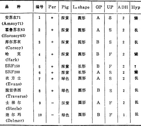 | 释义 | 大豆品种组合鉴定法 据陶嘉龄博士(1981)介绍,将7种品种鉴定方法组合起来,将混在一起10个大豆品种的样品逐个鉴别开来。从表12-1可以看到,第一步应用愈创木酚-过氧化物酶显色法,将10个品种分为1-8号品种(显色)与9-10号品种(不显色)二组;第二步,应用苗色鉴定法,将幼苗分为深紫色和绿色二组。按颜色,Per不显色,和幼苗深紫色的为9号品种,Per不显色和幼苗绿色的,为10号品种;并将1-8号品种分为幼苗深紫色的1-6号品种与幼苗绿色的7号和8号品种;第三步是按幼苗小叶形状,将小叶分为圆形和长形两种。分为小叶圆形的为1-6号品种,小叶长形的为5-6号品种。第四步应用蛋白质电泳鉴定,按电泳图谱的谱带类型分为A型和B型。6号和7号品种为A型,而5号和8号品种为B型。又将1-4号品种分为两组,1-2号品种为A型,3号和4号品种为B型。这时已将5-8品种分开,即过氧化物酶显性(+)、幼苗绿色、小叶圆形、蛋白质电泳谱带为B型的为8号品种;十、绿色,圆形和A型的为7号品种;十、深紫,长形和A型的为6号品种;十、深紫,长形、B型的为5号品种。第五步,应用尿素酶电泳鉴定,按其电泳谱带S和F型,将1-3号品种分为S型,4号品种为F型,已将4号品种分出。第6步应用酒精脱氢酶谱带分为两组,1-9号品种为2条谱带,10号品种为1条谱带。最后应用下胚轴长度测量法,将其分长和矮二种等级。下胚轴矮的为1号品种,下胚长的为2号品种。再按蛋白质电泳B型分为3号品种。至此已将全部品种分开。 表12-1 组合不同测定方法鉴定大豆品种的检索表 (陶嘉龄,1981)