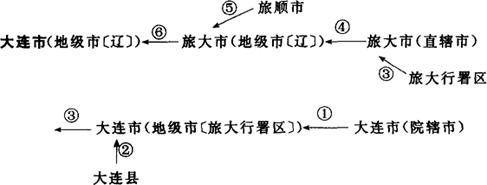 ①1898年为帝俄强占,日俄战争后为日本侵占。1945年光复后设大连市(院辖市)。1949年改地级大连市,隶旅大行署区。②1960年撤销大连县,并入大连市。③1950年10月,撤销1949年设的旅大行署区,改设旅大市(直辖市),直属东北人民政府;1952年后直属东北行政委员会。④1954年旅大市改地级市,属辽宁省。⑤1960年撤销旅顺市,并入旅大市,成为旅大市的旅顺口区。⑥1981年2月改旅大市为大连市(地级市),隶辽宁省。