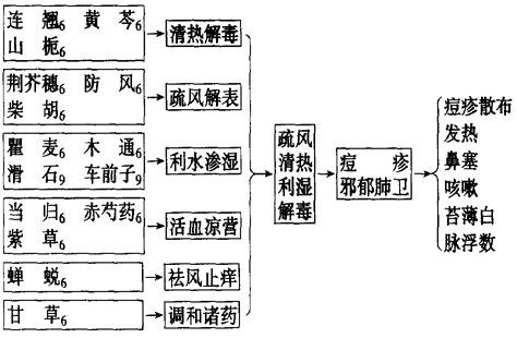 【应用】 1.水痘。 2.带状疱疹。 3.急性湿疹,接触性皮炎。 4.脓疱疮。 【注意】 忌辛辣油腻,肥甘厚味。 【类方】 消风散(《外科正宗》):由荆芥、防风、牛蒡子、蝉蜕、苍术、苦参、石膏、知母、当归、胡麻仁、生地黄、木通、甘草组成。功能疏风养血,清热除湿。主治风热、湿热侵袭人体所致的风疹、湿疹。 |
