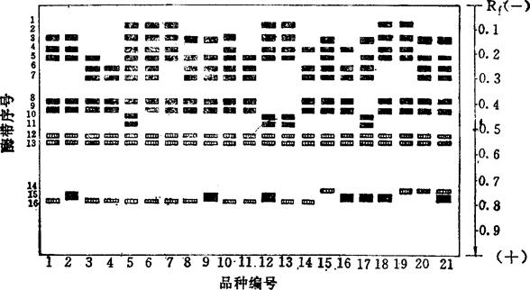 | 释义 | 大麦籽粒同工酶电泳鉴定法 1.鉴定依据 L.R.Nilson等(1966)利用蛋白质和同工酶淀粉凝胶电泳法对12个春性大麦变种进行鉴定研究;M.J.Burbidge利用不同凝胶成分和pH值进行大麦品种鉴定的研究;林雪琴(1987)利用聚丙烯酰胺凝胶酯酶和过氧化物酶同工酶电泳进行42个大麦品种鉴定的研究。结果表明,应用大麦干种子酯酶同工酶电泳具有品种图谱类型多,分别效果好(图17-8)。