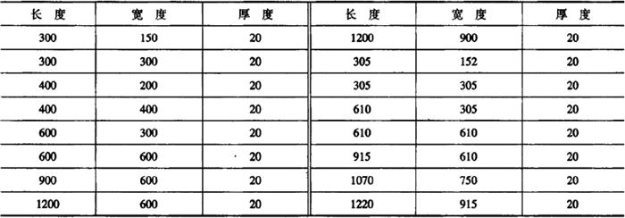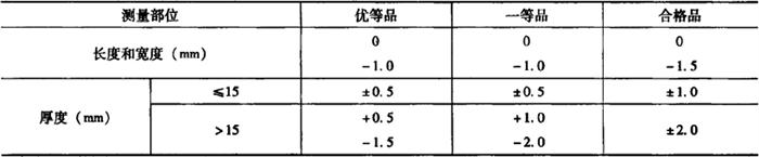 图15-3 板材厚度的测量 1~4-厚度测量点 异型板材规格尺寸的允许偏差,由供需双方协商确定。普通型板材规格尺寸的允许偏差,应符合表15-3中的规定。 表15-3 普通型大理石板材规格尺寸的允许偏差