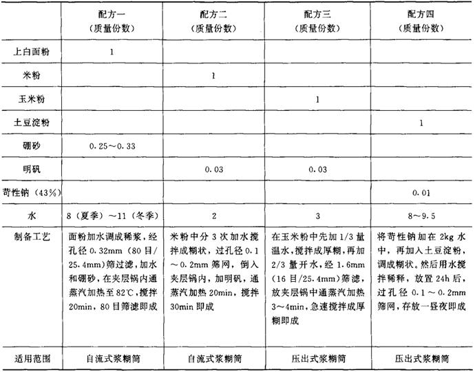 3.制备 (1)一般淀粉胶粘剂的配制。将淀粉与水混合,加入配合剂,加热搅拌使之糊化,或加入少量苛性钠在常温下糊化。常温糊化时,淀粉水分散体的浓度一般为3%~10%。常用胶粘剂配方与制备见表5-5-5。 表5-5-5 几种常用淀粉胶粘剂举例