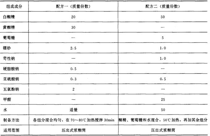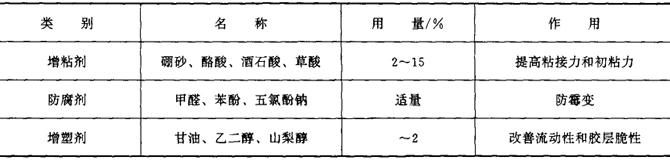 2.常用配合剂 淀粉胶粘剂中常用的配合剂有:交联剂(如硼砂,以增加粘度,提高耐水性),稀释剂(如尿素,使分子解聚,以调节适宜的粘度)等。配合剂的种类与用量详见表5-5-4。 表5-5-4 配合剂的种类与用量