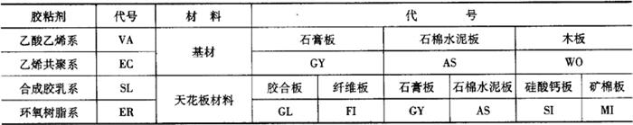 (2)代号 天花板胶粘剂的基材和材料代号,如表9-68所示。 表9-68 天花板胶粘剂的代号