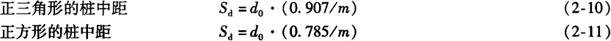 式中 Sd——夯实水泥土桩中距(m); d0——夯实水泥土桩的桩径(m); m——面积置换率(%)。 面积较小的独立基础或较窄的条形基础,可按面积置换率确定桩数,由桩数及基础尺寸确定桩距。 (4)基底下应铺50~150mm厚的褥垫层,当桩体承担较多荷载时,褥垫层的厚度取小值,反之应取大值。垫层材料可用中砂、粗砂、石屑或灰土。 2.夯实水泥土桩承载力及变形计算 (1)按现场复合地基荷载试验确定地基承载力。一级建筑物、地质条件复杂的场地或在同一场地处理面积较大时,按试验取得的参数进行设计。曲线上有明显比例极限时,可取比例极限对应的荷载;当极限荷载小于对应比例极限荷载的1.5倍时,取极限荷载的50%;或取相对变形值S/b=0.006~0.010所对应的荷载。 (2)复合地基承载力的标准值和单桩承载力标准值,可分别按式(2-12)和式(2-13)进行计算。