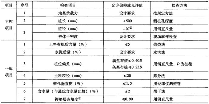 注:①夯填度指夯实后的褥垫层厚度与虚体厚度的比值; ②桩径允许偏差负值是指个别断面。 (6)地基承载力的检验:一级建筑物、地质条件复杂的场地或在同一场地地基处理面积较大时,应进行单桩复合地基载荷试验,检验数量不应少于3点;必要时还可进行多桩复合地基载荷试验。检验不合格时应采取补救措施。 |