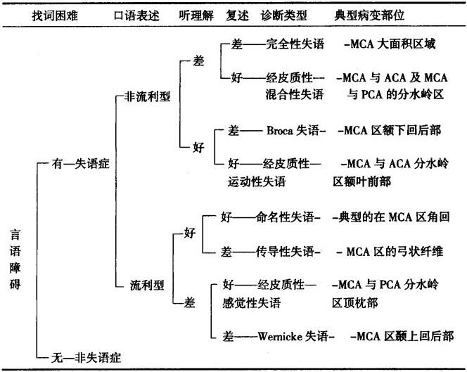 注:1.MCA指大脑中动脉,ACA指大脑前动脉,PCA指大脑后动脉。 2.所述病变部位均位于优势半球。 5.鉴别诊断 失语症常常需要与构音障碍和言语失用相鉴别,后两者有时与失语症同时发生。 (1)构音障碍 是指神经源性的言语运动损害,因发音器官神经肌肉的器质性病变所致,表现为言语肌肉运动的缓慢、乏力、不精确或不协调。它不同于失语症,是言语产生的困难,不是言语符号内容的障碍;因此不伴言语理解、阅读障碍或表达时的找词困难。失语症常见于优势半球病变;构音障碍常见于双侧半球或双侧中脑、桥脑、延髓的病变及后组颅神经的病变。失语症常伴随右侧偏瘫、偏身感觉障碍及偏盲等。构音障碍常伴饮水呛咳、吞咽困难、强笑、强哭、舌肌萎缩等,甚至有时伴四肢瘫、共济失调、肌张力障碍等。 (2)言语失用 是指大脑损伤引起构音运动的组合及程序控制障碍,造成随意表达困难,所以说是一种运动性言语障碍。构音过程常受累明显,有时也见发声失用。病人可能同时伴口面部肌肉的失用,但没有这些肌肉的麻痹和共济失调。言语失用常见于优势半球额下回的病变,但是也可见于优势半球顶叶或皮层下病变。Broca失语可同时伴有言语失用。言语失用的语言学特点包括:①发音错误(如语音的丢失、替换、歪曲、延长、增加及重复,在重复同样话语时表现高度不一致;②开始的辅音及讲话开始时困难,具有口吃的特点;③伴有努力寻找性、探索性和校正性构音动作,尽管注意到错误,但通常不能够预料或改正它们;④要求病人提高发音质量时可加重言语失用。对发音的要求越复杂,病人出现的错误就越多并且越严重;⑤自动-自发言语(如数数1~10)通常是完整的,而随意有目的的言语(如倒数10~1)是损害的;⑥由于拉长了正常的节律,重音和语调出现错误,产生了失韵律。 6.引起失语症的主要神经系统疾病 (1)脑血管疾病 ①脑梗死 包括脑血栓形成、脑栓塞等缺血性病变。优势半球大脑中动脉分布区的梗死是造成失语症最主要的原因。脑梗死通常发病突然,除表现言语障碍外,还可能伴有优势半球对侧的偏瘫、偏身感觉障碍及偏盲。病人既往常有高血压、高血脂、糖尿病、冠心病等病史。头CT上显示左大脑半球按血管分布的低密度病灶,头MR上显示相应部位长T1、长T2病灶。 ②脑出血 突然发病,临床表现及既往史与脑梗死相似,但头痛、呕吐、意识障碍等全脑症状明显。头CT上显示左大脑半球高密度病灶,头MR上在急性期信号演变复杂,亚急性期可见相应部位短T1、长T2病灶。 (2)肿瘤 生长在大脑半球的各种脑肿瘤,如胶质瘤、转移瘤、淋巴瘤等。脑肿瘤起病隐袭,逐渐进展,发病一定时期后常出现明显的高颅压表现以及因累及病变部位不同而产生不同的定位症状,包括言语症状。头CT及MR上常可见肿瘤瘤体、肿瘤内出血和钙化以及其周围指状水肿等表现。 (3)外伤 是战争时期造成失语症的主要原因。病前有头部外伤史,常伴有头痛、呕吐、癫痫、遗忘、意识障碍等,可以有不同的包括言语障碍在内的神经系统局灶表现。有的可能伴其他脏器损伤和骨折。头CT及MR常见各类血肿及脑挫裂伤。 (4)阿尔茨采默病 随着人口老龄化,AD发病率已明显增多。AD病人起病隐袭,早期有记忆障碍,以后逐渐出现其他认知障碍、情感障碍、行为障碍,智力全面衰退,影响工作及日常生活,晚期常伴精神症状及其他神经系统症状。言语障碍早期表现为命名性失语,以后可能发展为Wernicke失语。影像学上常见脑萎缩改变,早期多在颞叶海马,以后发展到全脑。 (5)脑炎 急性或亚急性起病,病初有的表现发热、头痛,以后可能出现癫痫、意识障碍、精神症状及其他一些神经系统局灶表现(包括失语症)。CT上有时可见低密度病灶,MR上可见长T1、长T2信号改变。脑电图上常表现慢波增多。 (6)脑脓肿 多急性或亚急性起病,可能有发热、头痛、恶心、呕吐、癫痫及其他一些神经系统局灶表现(包括失语症)。CT、MR上可见单发或多发病灶,多呈圆形,大的病灶内可以出现间隔,注射造影剂后常有环状增强。 7.失语症的治疗 (1)病因治疗 根据有关病因进行针对性的治疗,包括神经内科药物治疗及神经外科手术处理。有些疾病如阿尔茨采默病等目前尚无有效的治疗方法,应注意对病人的护理。 (2)失语症的药物治疗 目前尚无针对失语症的治疗药物。可试用改善脑的血液供应,增强脑的供氧及脑代谢的药物如二氢麦角碱类(依舒佳林、喜得镇、脑通等)、都可喜及西坦类(脑复康、三乐喜等)。还可试用安理申、艾司能等胆碱脂酶抑制剂,尽量延缓记忆减退的发展。伴抑郁情绪的病人用抗抑郁药物治疗,可能对言语症状的改善也有所帮助。另外,也有人试用溴隐亭、左旋多巴、苯丙胺等药物。 (3)康复方法 针对失语症的治疗,目前主要采用康复方法。这些方法很多,都是基于对失语症的不同理解而产生的。 经典或刺激疗法 为临床上常用的以改善言语机能为目的的基础治疗方法之一;它强调促进、刺激言语,而不是教授言语。Schuell等(1964年)提出了更细致的刺激疗法,其核心体现在以下六个原则上:①给予适当的语言刺激。根据失语症类型、程度,选择适宜难度的刺激,循序渐进;②强的听觉刺激和多途径的语言刺激;③反复刺激:一次刺激得不到正确反应时,反复刺激可提高反应性;④每次刺激引出相应的反应:可以评价刺激是否恰当,