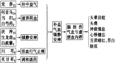 【要点】 本方用药在补益气血的基础上,配以川芎血中气药,行气活血,上达巅顶。配茯神、龙齿镇静安神。 【应用】 1.脑挫伤所致的眩晕、头痛等。 2.植物神经功能紊乱。 【注意】 本方为气血亏虚,瘀血内生之眩晕头痛而设,若属肝阳上亢或肝肾阴虚,虚阳上扰之眩晕,慎用本方。 【类方】 1.归脾汤(《济生方》):由人参、白术、茯神、炙黄芪、龙眼肉、炒酸枣仁、木香、当归、炙甘草、远志组成。功效益气养血,宁心安神。用于气血亏虚之眩晕、心悸、失眠。 2.补气解晕汤(《傅青主女科》):由人参、炙黄芪、当归、炒荆芥穗、姜炭组成。功效补益气血,主治产后气虚血晕。 |