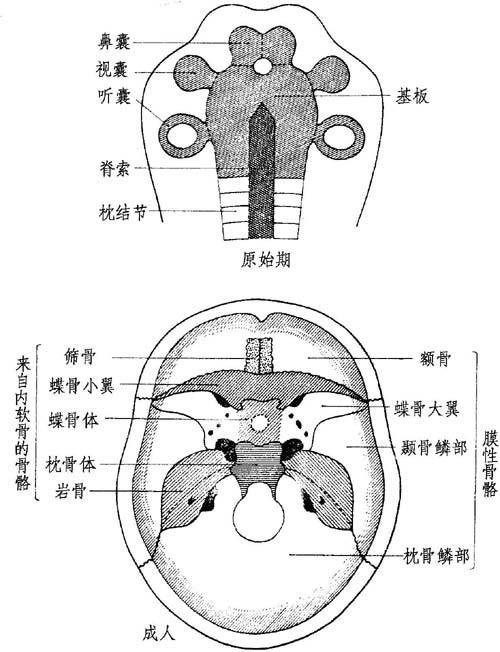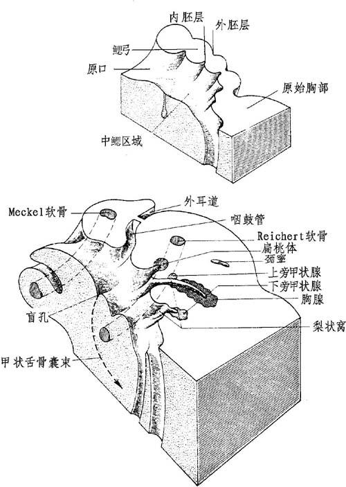| 释义 | 头原盖的器官发生 神经管发育很明显,尤其是在背部伸入头部形成一非常重要的项曲(近90°)。紧接着形成的颈部将使颈曲变直(颈部的形成)。 头胚和咽肠:①上方:发出一个背部憩室,位于口咽膜稍后方,叫Rathke囊(腺垂体);②外方:摊成鳃器官内面的平板;③下方:盖过中鳃腺部分(舌和甲状腺体)。 头部的中胚层与器官的残余相反,除了第三或第四头颅体节外,未分化成体节。 此头部中胚层将组成①向前上方:颅索、眼外肌;②向外方:鳃器官;③向下方:中鳃部分;④向前和向下:面芽基。 头体节将发育成①向前成为颅骨的组成部分;②向后成为前几个颈椎骨。 肌形成成分,其在中鳃腺部分移行以便形成舌肌。此等移行偕同大舌下腺神经一并进行。 外胚层在一定的地方逐渐增厚以便形成感官基板,神经感官将同神经管延长部分更早发生联系。 脊索原基完全消失后便混入脊椎骨和蝶颅骨中。这些残余的脊索原基可能成为恶性肿瘤或脊索瘤(属嗜酸性细胞类)。此等肿瘤有时发生在蝶颅部(鼻咽腔)或发生在骶尾部。 一、软骨颅和感官包囊(图1-1)