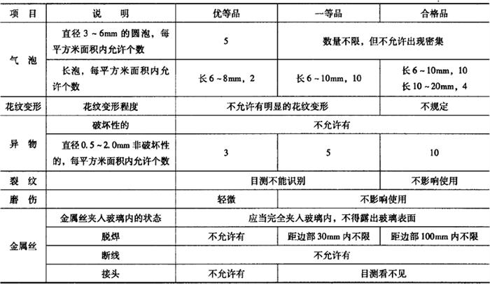 | 释义 | 夹丝玻璃 夹丝玻璃也是安全玻璃中的一种。夹丝玻璃用连续压延法制造,即将普通平板玻璃或磨光玻璃、彩色玻璃加热到红热软化状态,再将预热处的金属丝网或金属丝压入玻璃中间而制成的。夹丝玻璃的表面可以是压花或磨光的,颜色可以是无色透明或彩色的。 夹丝玻璃在建筑装饰工程中,主要适用于震动较大的工业厂房门窗、屋面、采光天窗,需要防火的仓库、图书馆的门窗,建筑物的复合外墙,公共建筑的阳台、楼梯、电梯间、走廊等。 (一)夹丝玻璃的特性 夹丝玻璃之所以称为安全玻璃或防火玻璃,是因为其具有明显的防火性、安全性和防盗性,这是这种玻璃最突出的特性。 1.夹丝玻璃的防火性 夹丝玻璃即使被打碎,玻璃中的夹丝也能支住碎片,很难崩落和破碎。当火灾蔓延时,夹丝玻璃可以隔绝火势,即使火焰穿破玻璃时,也可遮挡火焰和火星的侵入,有防止从开口处扩散燃烧的效果。 2.夹丝玻璃的安全性 金属丝网或金属丝在玻璃中起着增强作用,与普通平板玻璃相比,夹丝玻璃的耐冲击性和耐热性好,在外力作用和温度剧变时,玻璃破而不散、裂而不缺,可避免带棱角的玻璃碎块飞出伤人。 3.夹丝玻璃的防盗性 普通平板玻璃很容易被打碎,根本不能起到防盗的作用,而夹丝玻璃则不同,即使玻璃已被破碎,仍有金属网在起作用,因此夹丝玻璃具有一定的防盗性。 (二)夹丝玻璃的规格 根据我国建材行业标准《夹丝玻璃》(JC433-91)中的规定:国产的夹丝玻璃产品分为夹丝压花玻璃和夹丝磨光玻璃两类。产品按厚度不同,可分为6mm,7mm,10mm三种;产品按等级不同,可分为优等品、一等品和合格品;产品的尺寸一般不小于600mm×400mm,不大于2000mm×1200mm。 (三)夹丝玻璃的质量要求 夹丝玻璃的外观质量标准如表17-18所示,夹丝玻璃的尺寸允许偏差如表17-19所示。 表17-18 夹丝玻璃的外观质量标准