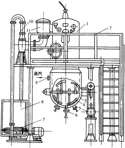 1-上锅体 2-支架 3-下锅体 4-搅拌器 5-减速箱 6-进出料口 7-多级离心泵 8-水箱 9-蒸汽入口 10-水力喷射器 11-汽液分离器