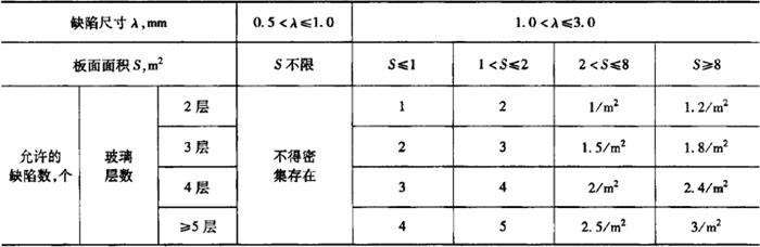 3.要求 (1)材料 1)浮法玻璃、压花玻璃、夹丝网玻璃、夹线玻璃、钢化玻璃、吸热玻璃、半钢化玻璃等应符合相应的规范要求。 Ⅲ类夹层玻璃不使用夹丝玻璃及钢化玻璃。 2)聚碳酸酯板、聚氨酯板、丙烯酸酯板等塑料材料应符合相应标准、技术条件或订货文件的要求。 3)聚乙烯缩丁醛等中间层材料应符合相应标准、技术条件或订货文件的要求。 (2)外观质量(表6-8) 表6-8 夹层玻璃的外观质量要求