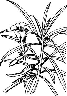 图2-21 夹竹桃 (1)植物学特征。夹竹桃,夹竹桃科,夹竹桃属,常绿灌木。叶似竹,花似桃。分枝多而软。叶对生或3枚轮生,窄披针形,中脉明显,叶肥厚革质,聚伞花序顶生,花萼直立,花冠五裂,漏斗状,单瓣或重瓣,花色白、粉红或黄色,微有香气,花期5~10月,蓇葖果,矩圆形。 (2)对环境与土壤的要求。夹竹桃喜光照,温暖和湿润的气候环境,不择土壤,耐瘠薄,适应性强。 (3)施肥技术。扦插后栽植时,需在坑内或盆内施入少量基肥,每年早春施入基肥,生长期每1~2个月浇施1次有机肥稀肥水。开花前浇施淡肥水,即可枝茂花繁。 |
