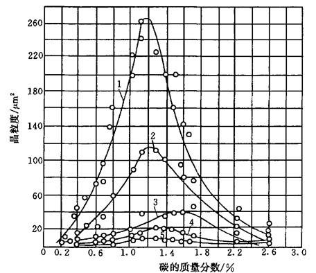 图12-20 碳含量与奥氏体晶粒度 1—1300℃保温3h;2—1200℃保温3h;3—1100℃保温3h;4—1000℃保温3h;5—900℃保温3h