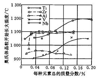 图12-21 合金元素对低碳奥氏体晶粒粗化温度的影响 ω(C)=0.2%,ω(N)=0.0063%~0.0075%