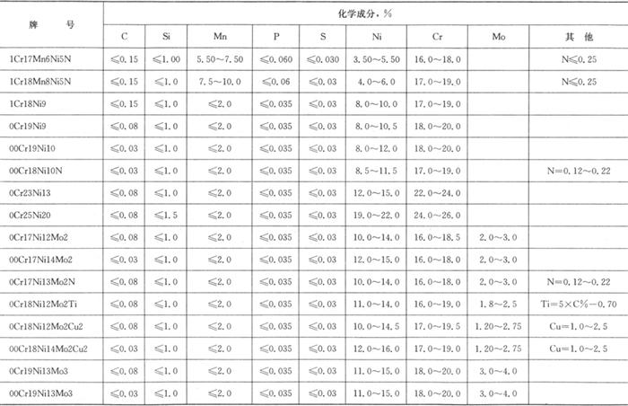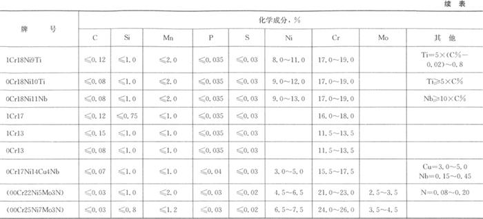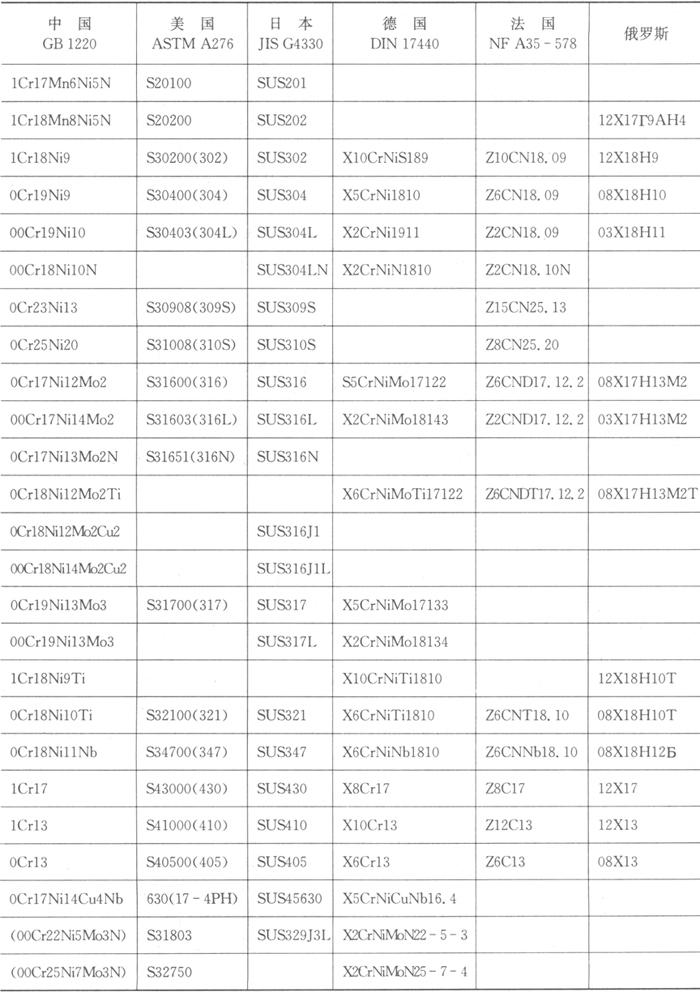 表3.1-1、表3.1-2分别列出我国通常用于焊接结构件的不锈钢牌号、化学成分和力学性能。表3.1-3列出各国不锈钢牌号的对照。