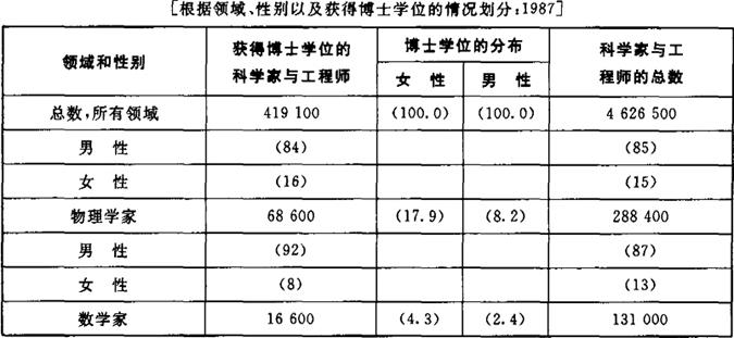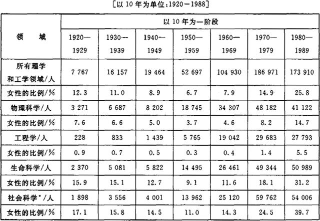 | 释义 | 女性与科学职业 前一本关于科学、技术与社会的《手册》[斯佩格-勒辛和普赖斯,1977]没有讨论科学中的女性的章节。事实上,那本书的索引也没包含女性或性别的条目;惟一相近的参考文献是关于“科学家的性别角色”,而且只有3页。 那本书反映出人们当时对科学中的女性问题不够重视。1960年到1977年间[前一本《手册》出版于1977年],《社会科学引文索引》(SSCI)的主题索引在女性或性别与科学或者女科学家的标题下仅仅列出了16篇文章。(2)在70年代中期发表了一批具有里程碑意义的文章,特别是巴耶尔和阿斯廷[1975]讨论报酬结构的文章,雷斯金[1976]对化学中的女性的研究,以及朱克曼和科尔[1975]讨论美国科学中的女性的早期文章。1978到1991年[8月]间,在《社会科学引文索引》的主题索引中,在女性或性别与科学或女科学家的标题下有95篇文章。 现在,对这个主题的研究明显增多了,人们的注意力也在提高。在过去的15年中,讨论女科学家的论文伴随着大量的学术研究一起出现:女性在法律、经济、艺术、文学和政治学等领域中的当代地位与历史地位、活动及其贡献。这反映了学术界对女性研究的主动性在提升。这一研究把女性作为研究主题,并把性别看成是知识和社会发展中的基本要素。然而,对女科学家的研究和关注并非是简单地对女性在科学中的比重做出反应。女性长期以来就“在科学中”,但并不必然地意味着她们的“科学”角色很重要或很有影响[参见罗西特,1982,以及朱克曼、科尔和布鲁埃尔,1991中的相关论述]。在本章中我们将发现,数量虽然能够表明女性的在场,但是不意味着她们的参与具有重要意义。与其他职业一样,女性在科学中的数量虽然是显而易见的,但是她们在职务、岗位和报酬上还是很有限的或受限的。 虽然还没有一个世纪以来女性在科学中的就业状况的比较性数据[参见维特尔,1981的讨论],但是授予博士学位的数据还是能找到的。(3)博士学位的授予并不直接对应于职业参与,因为女性在科学中很少有择业权,特别是在二战前期;实际上,她们的选择范围是女子学校的教员或大学实验室的研究副职,从事这些职业的女性很少有自主性,很少有甚至根本没有升迁机会[罗西特,1982]。下面的情况并不罕见,那些获得理学博士学位的女性面临的状况是根本没有就业前景,特别是在二战前期;而最近的数据显示,获得理学和工学(S/E)博士学位的女性90%以上都属于计时的劳动力[维特尔,1981,第1~315页]。 虽然关于博士学位的历时数据存在某些限制,但是它们真实地显示了20世纪20年代以来接受专业训练的女性的比例[与男性相比]。浏览表10.1我们会发现,在过去的70年里,授予女性的博士学位的比例并没有呈线性增长。20年代[12.3%]和30年代[11%]授予女性的博士学位的比例要高于40年代[8.9%]和50年代[6.7%],甚至也高于60年代[7.9%],(4)直到70年代,这个比例才达到并超过了40年代之前的水平。在70年代,女性占了全部理学和工学博士学位的14.9%。持续的增长发生在80年代,1980-1988年间,女性占了理学博士学位的四分之一以上[25.8%]。 表10.1 理学和工学(S/E)博士学位授予情况