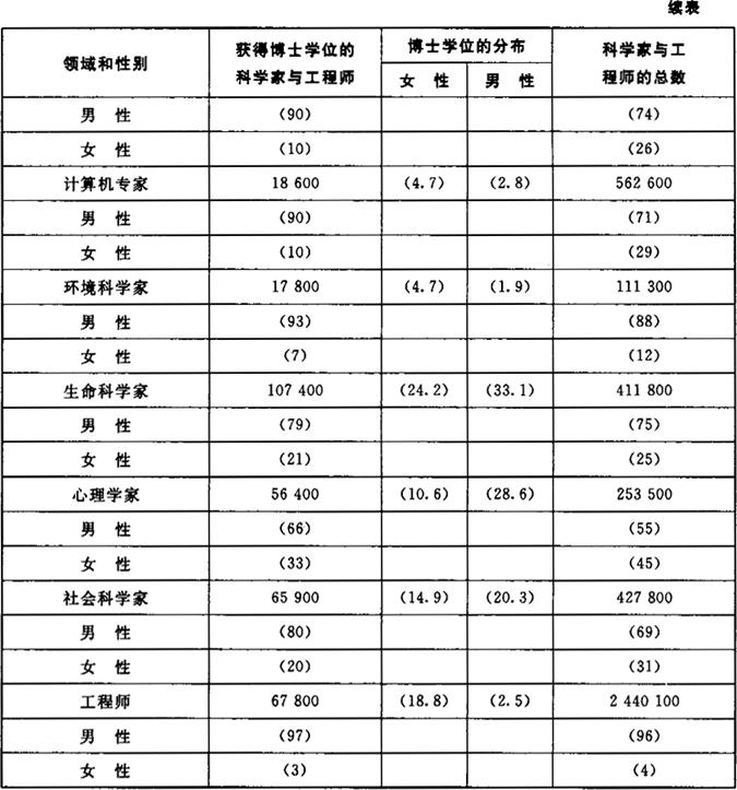 资料来源:科学技术职业委员会(1989,表2.1) *包括心理学 所以,女性在博士水平的科学家和工程师中的比例提高了。但是,正如上文所强调的,我们的问题不是女性简单的参与或现有的数量,而是她们的相对地位和报酬。因此,在评价女性的职业时,本章的问题是:(a)与男性相比,女性的职位和地位——领域、部门、机构类型、等级和薪水——如何?(b)与男性相比,女性在科学中的业绩——产出能力——如何,这一点为什么重要?(c)基于何种因素来解释女性在科学中的相对地位、成绩和职业成就?由于本章在《手册》中的篇幅有限,《手册》总是要涵盖更广泛的主题,所以讨论数据以及这些问题的含义只能围绕最核心的方面进行。 总的来说,本章的问题是科学职业的性别分层。只要考察一下关于女性状况[与男性相比]的指标,我们就能发现,与其他职业一样[福克斯和海塞-比贝尔,1984;雷斯金和鲁斯,1990],科学中的女性和男性在活动的领域、工作场所、职位和薪水方面是有差别的。性别影响着他们在科学中的职位、等级和报酬。性别也可以影响科学和技术的意义——通过框定问题、解释数据,通过建构知识以及知识的应用。这些考虑是维基克曼和凯勒的文章的主题。 本章关注的是具有博士学位的人员,因为对该群体而言,从研究、研究的产出能力及其影响等问题入手是最恰当不过的。在所有的领域中,女性占全部科学家和工程师总数的15%,占博士水平的科学家和工程师总数的16%[表10.2]。我们发现,在不同的领域中,女性的就业非常不平衡[表10.2]。绝大多数女性[82%]集中在三个领域,即生命科学、心理学和社会科学,比例分别是33%、29%、20%。相比之下,男性在物理科学和数学中工作的可能性几乎是女性的两倍,在工程学中工作的可能性是女性的7倍。男女分布最悬殊的是工程学——在这一领域中,女性的比例是2.5%,男性的比例是18.8%。因为工程学中的女性比例很小,所以本章只能探讨“科学中”的女性。实际上,这些文献涵盖了理学/工学女博士的绝大部分[97.5%]——她们工作在科学领域,而不是工程领域。 表10.2 科学家与工程师(S/E)的就业(5)