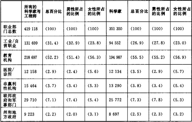资料来源:国家科学基金会(1990,表2和表4) 注:由于四舍五入,总比例不能达到100%。 译者注:表中数据,无括号的,单位为“人”;有括号的,单位为“%”。表10.3、10.5同此。 女性在不同研究领域中的分布情况表明,科学的各种过程[女性进入各种领域的自我选择过程以及对女性的准入和参与的社会限制因领域的不同而不同]是不均衡的。然而,决定女性在各领域中的不同分布——尤其是生命科学领域中女性的比例比物理科学要高——的因素并未完全弄清[朱克曼,1987,第128页]。女性在子领域中的地位及其含义也没有得到讨论。在研究科学中的女性时,我们必须超越这样一种潜在的假设,即女性在不同领域之间以及在特定领域内部的地位都是同一的。与男性相比,女性在子领域中的地位尤其重要,因为科学研究正是在子领域中展开的。子领域可以在幅度和维度上被刻画成一种新兴的,相比于较少获得资助的领域来说,它们得到的资金更多,相比于低速增长的领域来说,它们可以高速增长。这些维度影响着学术成就的发展速率和影响度。在新兴的、资金来源充足的、高增长的领域中,有许多问题有待研究,它们的影响更容易得到确立,获取必要的研究资源[资金]也更方便。(6) 除了分布的领域模式外,女性和男性还分布在多少有些不同的职业部门[表10.3]。最引人注目的是,在所有的领域中,女性进入工业或自营职业的可能性小于男性。科学和工程学中24%的女性在这种部门中工作,而男性的比例是33%。尽管人们广泛地鼓励[比如,参见卡塔利斯特,1991]工业吸收和聘用女科学家和工程师,但是女性在工业领域找到工作的可能性还是小于男性。这也许是这些鼓励政策以及女性介入工业职业的时间尚短所致[比如,我们可以与女性参与高等教育这一更为悠久的传统作一下对比]。 表10.3 受雇的博士水平的科学家和工程师(S/E) [根据领域、性别和部门划分:1987]