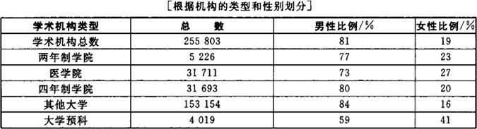 资料来源:科学技术职业委员会(1989,表4.13) *不包括工程师 此外,与男性相比,女性更有可能在医院、非赢利性机构、联邦政府以及州和地方政府找到工作。然而,所有这些部门加起来也仅仅吸收了科学家/工程师的一小部分——女性的19.4%和男性的15.2%。 学术部门吸收了博士水平的科学家和工程师的绝大部分——男性的51%和女性的56%。[然而,与科学家相比,工程师在学术机构之外供职的可能性要大得多。因此,如果我们把研究群体限制在科学家身上,而把工程师排除在外,那么男性和女性在学术机构中的比例甚至会更高,分别是55%和57%。]站在领域的角度看,与其他部门相比,在学术机构工作的女性比例最高的是数学(7)[81%]、生命科学[67%]和社会科学[68%][数据没有列出来]。在计算机科学、环境科学和心理学中,女性更有可能进入非学术部门。从领域角度看,相同的模式对男性也同样有效。这可能反映了学术机构之外的工作市场的状况——工作市场对计算机科学和环境科学的需求更大,与数学家(8)、生命科学家和[其他]社会科学家相比,对心理学家的需求也更大。 由于学术机构是博士水平的科学家/工程师的主要供职部门,因此着重考察女性和男性在这一部门中的组织地位和等级具有重要的意义。关于机构类型的数据代表了学术机构的广泛的分类[表10.4]。然而,这些数据指出了这样一个模式:女性在高等机构中的比例比较低。首先,在低于学院水平的教育机构中,具有博士学位的科学家和工程师的比例非常低[低于2%];但是,正是在这样的机构层次上,女性的比例最高[41%]——相比于男性。在这一层次之上的情况是,与男性相比,女性在大学中的比例[16%]低于两年制的学院[23%]和四年制的学院[20%]。最令人感到惊奇的是,与男性相比,女性在医学院的比例[27%]要高于其他高等教育机构。这些数据并未显示出女性在每一种机构中的地位——与男性相对照。因此,我们不知道医学院的女性学术职务是否更倾向于具有较低的等级甚或边缘职位[讲师,辅导员]。 表10.4 在学术机构中供职的博士水平的科学家和工程师