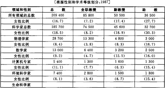 资料来源:国家科学研究委员会(1991,表6) 女性在大学中的比例低于两年制和四年制的学院的现象值得注意。具有大学水平的机构在设备上是现成的,并且招收研究生,其中合作的机会[教师和学生的合作]可能更多,因此这样的机构更有利于研究的展开。女性在大学中比例较低的现象影响着研究的方式和途径,也影响着她们的地位——如果与产出能力有关的话,参见下文的讨论。 因为学术等级的规定和划分很清楚,所以它们是表现科学职位的有效指标。在所有的领域中,等级越高,女性的比例就越低[表10.5]。大体上看,女性占助教的28%,占副教授的17%,而仅占全职教授的7%。虽然女性在较高等级职位中的低比例模式对所有领域都适用,但是不同领域的比例水平各不相同。女性集中在三个领域——生命科学、心理学和社会科学,因此与其他领域相比,在这些领域中我们发现女性在每个等级中的比例相应较高。在生命科学、心理学和社会科学中,女性占助教的比例分别是32%、48%和34%,占副教授的比例分别是22%、28%和18%。 表10.5 四年制学院和大学中具有博士学位的科学家和工程师