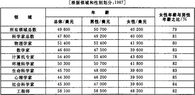 资料来源:国家科学基金会(1990,表格20,21) 注:总数包括辅导员、其他以及未报告的数据。由于四舍五入比例不能达到100%。 然而,除心理学外,女性占全职教授的比例在每个领域中都很低。在一半的领域中——物理科学、数学、环境科学与工程学,女性占全职教授的比例是5%,甚至更低。虽然在20世纪70年代具有博士学位的女性数量增长了,虽然在过去的15~20年间,她们已经步入了职业的成熟期,但是全职女教授的比例在20年间几乎没什么变化。1973年,理学/工学领域的全职教授有4%是女性,1987年,这一比例也仅仅是7%[也可参见A.吉本斯,1992]。 表10.5中的数据并没有包含那些影响学术等级的变量,比如获得哲学博士学位或产出能力的时间。然而,那些涵盖了这些变量的研究告诉我们,在学术等级中,女性和男性在科学中的地位十分悬殊。乔纳森·科尔[1979]发现,根据他的分类,在产出能力的每个层次,女科学家升迁的可能性都比男科学家低。这一点对职位类型[较好的和较差的部门]的研究来说也同样有效。埃亨和斯科特[1981]也发现,就那些在获得博士学位的时间、博士的研究领域、授予博士的机构和种族都相同的女性和男性而言,在自然科学家、物理科学家和生物科学家的学术等级中普遍存在较大的差异。在获得博士学位后的10~19年中,男性升为全职教授的机会比女性高50%。在比较年轻的男性和女性中,女性升为副教授的机会更小,这与婚姻状况、子女状况以及她们的工作性质是研究还是教学无关。 此外,一项关于从1955到1986年间着名的博士后奖学金的获得者的研究报告[松纳特,1990]指出——对获得博士学位的时间、领域、奖学金进行了控制,女性预期的学术等级比男性低1/3。然而,在这项研究中,女性在学术等级方面的劣势在生物科学中并不存在,它主要存在于物理科学、数学和工程学中。在松纳特的样本中,女生物科学家的学术等级的升迁与男性相近。这再次证明了学科差异的重要性。 女性和男性在等级和升迁方面已经得到证实的悬殊,与他们在科学奖励、荣誉和声望方面较小的性别差异之间形成了鲜明的对比。第一,在一个由565位自然科学家和社会科学家构成的样本中,性别[男性]与奖励的相关性是很低的,虽然男性与获奖的关系随领域的不同而不同——在社会学中这种相关性最强[J.科尔,1979,第59页]。第二,在上述样本中,如果把研究的产出能力考虑在内的话,性别对科学声望的影响是很小的[J.科尔,1979,第119页]。这表明,在系和大学的制度层面上,更容易产生不平等。不平等出现在组织性场所中的可能性更大,这类场所有其特殊的升迁方式,但很少出现在更普遍的科学学科和科学共同体的报酬和声望机制中。 在科学中,学术承认被看做是一种财产[科尔和科尔,1973],是“这个领域中的货币”,学术需要的是承认而不是其他形式的回报[斯托勒,1973]。因此,尤其在学术机构中,人们认为“确保成绩的推动力”不是薪水,而是对过去、现在或预期成绩的象征性承认[什梅尔斯尔和孔堂,1980,第6页]。但是,就像在其他职业和机构中一样,在分析科学中性别群体的分层时,薪水的不平等仍然是一个十分有效的指标[福克斯,1981]。由于薪水在科学中不仅具有物质价值,而且具有特殊的象征意义,因此有必要对女性和男性的报酬状况进行考察。 在有博士学位的全职科学家中,女性的报酬是男性的78%到85%,这要看是什么领域[表10.6]。有关薪水的数据[来自国家科学基金会]包含了领域和受教育程度[博士水平]方面的变量,但是与雇员的特征[与薪水相联系]及其工作环境无关。通过考察科学家的个人特征[比如年龄和资历]和工作特征[比如供职的部门],我们能在多大程度上解释理学/工学领域中女性和男性的薪水差异呢? 表10.6 具有博士学位的科学家和工程师的年薪中位值