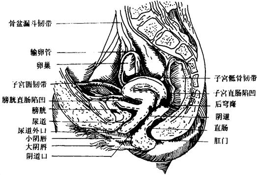 图3 女性盆腔矢状断面观 女性生殖器官包括卵巢、输卵管、子宫和阴道。 卵巢是一对实质性器官,呈扁椭圆形,位于子宫两旁,借卵巢悬韧带及骨盆漏斗韧带固定于骨盆中。卵巢实质的浅部为皮质,含有许多原始卵细胞。性成熟后,每个排卵周期一般都有一个卵细胞成熟,以破溃的形式从卵巢排入腹腔。卵巢深部为髓质,含有血管和神经。 卵巢能产生性激素,对性器官发育及性欲的激发起重要作用。 输卵管为一对喇叭形状的肌性管道,中部有峡部和壶腹部。壶腹部长而宽,通常是卵子受精的地方。 子宫为厚壁中间呈空腔的肌性器官,形状尤如倒置的梨。整个子宫分为三部分,即子宫底、子宫体和子宫颈。子宫颈下端突入阴道,容易被病原微生物感染或异物刺激引起炎症或癌症。 阴道上方连接子宫,下方延续外生殖器,属于肌性管道,是排经及分娩的途径,也是性交器官。性冲动以及分娩时,阴道扩张伸长,以适应阴茎插入或胎儿娩出。阴道本身没有分泌腺,通常所见到的乳白色分泌液是阴道壁的渗出物及子宫颈的分泌物。 阴道下部以阴道口通往阴道前庭。 女性外生殖器包括阴阜、大阴唇、小阴唇、阴蒂和阴道前庭。 阴阜位于耻骨联合前方,皮下脂肪组织很厚。青春期,此处开始长阴毛,性成熟后,阴毛呈倒三角分布。 大阴唇是一对纵行隆起的皮肤皱襞,在阴阜的下方,分别形成唇上及唇下联合。正常情况下,两侧大阴唇在正中线处合拢,覆盖小阴唇、阴道口及尿道口,可以防止微生物及异物进入。性冲动时,大阴唇隆起向两侧张开,露出阴道口。大阴唇外侧皮肤色素沉着,青春期开始长出阴毛,大阴唇内侧皮肤光滑湿润,触觉十分敏感。刺激阴蒂时阴蒂会勃起,引起性冲动。 阴道前庭位于两侧小阴唇间的菱形区,前上方与阴蒂及阴蒂系带相邻,下部有阴道口。阴道口两侧粘膜深部有一对豌豆大的前庭大腺,又称为巴氏腺,巴氏腺开口于小阴唇与处女膜之间。性冲动时,巴氏腺能分泌黄白色粘液,润滑阴道口。 |