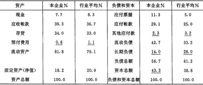 分析资产负债表时,除前述选取若干项目用以计算流动比率、速动比率和资产负债率等指标外(参见上述第9题、上述第10题、上述第11题),还可进行以下两种分析:(1)将本期资产负债表与以前几年的资产负债表相比较,分析各项资产、负债和所有者权益的变动情况。这种分析,有利于揭示各项目在本年内发生的结构性变化,也为编制财务状况变动表提供基础,揭示现金流量的来龙去脉。(2)计算表内各项目占资产总额的百分比。这一分析可看出每项资产对资产总额的关系,或每项负债和资本对资产总额的关系。计算出这一百分比后再与本行业的平均水平进行比较,便可看出本企业与本行业的差距。例如本企业与行业平均比较资产负债表如下: