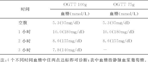 应该在怀孕后第一次检查时进行GDM危险评估。具有GDM高危临床表现(如显着肥胖,有GDM病史、尿糖或糖尿病家族史)者应尽可能早的检测血糖水平。如果空腹血糖CFPG)≥7mmol/L或任意血糖≥11.1mmol/L且有明确的高血糖症状,即满足糖尿病的诊断标准,否则需要再测一次血糖以确诊。对于初次筛查时未诊为GDM的高危妇女及中等危险的妇女应在妊娠24~28周时进行以下推荐检查之一。 1.一步检查 行100g口服葡萄糖耐量试验(OGTT)。 2.二步检查 口服50g葡萄糖(葡萄糖耐量试验,GCT)后1小时进行初次筛查,测血浆或血清葡萄糖水平,对于GCT中血糖超过阈值的妇女进行再诊断性的100gOGTT。如果GCT中把葡萄糖阈值定为≥7.77mmol/L,则可确诊近80%的GDM妇女,而将切点定为≥7.22mmol/L时,则可确诊者增加到90%。 100gOGTT诊断标准:空腹≥5.27mmol/L,1小时血糖≥10mmol/L,2小时血糖≥8.60mmol/L,3h血糖≥7.77mmol/L。以上不同时点血浆葡萄糖水平有两项或多项满足标准即可诊断GDM。另外,应该在清晨隔夜空腹8~14小时时进行检测。也可做75g糖负荷试验,但其在鉴别高危婴儿及母亲的有效性方面不如100gOGTT。 对于满足以下所有条件的低危妇女无须检测血糖:①年龄<25岁;②怀孕前体重正常;③属于GDM发病率低的种族;④一级亲属没有糖尿病患者;⑤没有糖耐量异常史;⑥没有难产史。 (二)诊断标准之二 1.主要采用3个标准 (1)第一,依据第三届国际GDM会议即美国国家糖尿病资料组(NDDG)推荐的3小时100gOGTT诊断标准。静脉血浆空腹血糖为5.8mmol/L,1小时血糖为10.6mmol/L,2小时血糖为9.2mmol/L,3小时血糖为8.1mmol/L,如有两个或两个以上值大于或等于以上标准则诊断为妊娠期糖尿病(GDM);有一个值大于或等于以上标准则诊断为妊娠期糖耐量减低(gestational impaired glucose toler-ance,GIGT)。 (2)第二,WHO标准。建议行2小时75gOGTT,只要2小时血糖≥7.8mmol/L即可诊断。 (3)第三,C&C-GDM标准。在美国普遍采用的是由Carpenter与Coustan(1982年)修改的O’sulli-van与Mahan标准,该标准是基于孕妇群体检测,同时考虑到GDM母亲及其胎儿的风险因素而制定的。ADA从2000年开始采纳Carpenter与Cous-tan(C&C-GDM)血浆葡萄糖阈值诊断C&C-GDM阈值低于以前所推荐的国家糖尿病数据组(NDDG)阈值。有研究显示由NDDG阈值除外GDM但符合C&C-GDM血浆葡萄糖阈值GDM诊断的孕妇,围产期并发症(巨大儿、新生儿低血糖、高胆红素血症)风险显着增加,因此C&C-GDM血浆葡萄糖阈值能更好地预测并发症风险,从而支持ADA采纳C&C-GDM阈值用于GDM诊断。 2.种族特异性 Pendula等对中国、日本、菲律宾、白人及夏威夷本土人GDM的患病率研究表明,夏威夷地区的肥胖和糖尿病的患病率虽高,而GDM的患病率在这几组中却最低,中国人的患病率明显高于其他种族,且大部分中国人的OGTT 1小时、2小时及3小时血糖值均高于诊断标准,而其余大部分种族均仅1小时、2小时血糖升高,提出应制定种族特异性的诊断标准。 3.诊断方法 目前常用的诊断方法分为一步法和两步法。 一步法是直接采用OGTT 75g,采用世界卫生组织标准。 两步法为50g葡萄糖筛查,如1小时血糖>7.8mmol/L则进行OGTT 100g或OGTT 75g。OGTT 100g采用NDDG或C&C-GDM诊断标准,OGTT 75g采用加拿大糖尿病协会诊断标准。 4.诊断标准 WHO诊断标准:空腹≥7.0mmol/L(≥126mg/dl)或75gOGTT2小时≥7.8(≥140mg/dl),具备一条即诊断GDM。 (三)妊娠期糖尿病酮症酸中毒 糖尿病酮症酸中毒突出的临床症状和体征是脱水、酸中毒以及随之而来的电解质紊乱。 生化检查可见严重的糖尿和酮尿,脱水严重时,血红蛋白、红细胞压积、白细胞计数升高,当体液量和肾血流量减少时可能发生肾前性氮质血症。 酮症酸中毒的生化指标是:血浆葡萄糖>300mg/dl,血浆碳酸氢盐<15mmol/dl,动脉pH<7.30。作者主张采用传统的酮症酸中毒定义,即明显的酮血症、糖尿以及代谢性酸中毒(如动脉血分析pH<7.25或碳酸氢盐<10mmol/L)。 从中度至重度酮症酸中毒发展过程中,血清丙酮是高的,血清碳酸氢盐降低,血钠高于正常,血钾升高。一般说酮症酸中毒血清葡萄糖水平在300~350mg/dl,但妊娠糖尿病患者血糖在150~300mg/dl范围时也有酮中毒发生。 (四)妊娠合并糖尿病性精神病 主要危险因素评分: 1.青春期妊娠10分。 2.既往妊娠有精神病治疗史10分。 3.White分型中的B、D型和F型,可能还包括C型9分。 4.婚姻问题5分。 5.未婚妊娠者5分。 6.患有糖尿病以外的其他疾病5分。 7.有2次以上的自然流产或死产史3分。 8.年龄超过35岁3分。 9.肥胖症2分。 10.社会经济地位低下者1分。 总分>20者均有精神病学上要处理的问题,计分越高,精神障碍情况越严重。 十一、鉴别诊断 妊娠合并糖尿病应与妊娠生理性糖尿病鉴别。妊娠期可因暂时性肾糖阈值降低而有糖尿,但空腹血糖正常,必要时做糖耐量试验相鉴别。 (一)糖尿病可否妊娠的指标 1.糖尿病妇女于妊娠前即应确定糖尿病的严重程度 一般认为D、F、R级糖尿病一旦妊娠,对母儿危害均较大,应避孕,不宜妊娠。若已妊娠,应尽早终止妊娠。 2.器质性病变较轻 血糖控制良好者,可在积极治疗、密切监护下继续妊娠。 (二)妊娠期糖尿病筛查 预防妊娠期糖尿病,可用下列方法进行筛查,发现具有高危孕妇,应及早发现患者、及早治疗、及时控制病情。 1.妊娠24~28周孕妇。 2.35岁以上高龄孕妇。 3.糖尿病家族史者。 4.原因不明的习惯性流产者。 5.先天畸形儿分娩史者。 6.足月妊娠分娩4000g以上儿史者。 7.原因不明围生期死亡史者。 