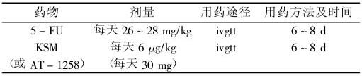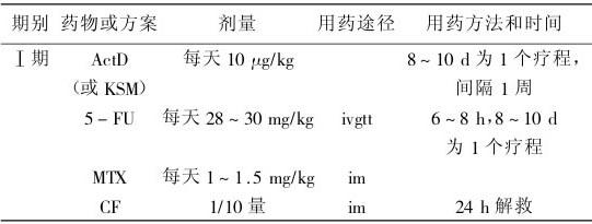 ②5-FU+KSM 方案:疗程间隔16~21d(表4-6)。 表4-6 绒毛膜上皮癌Ⅱ-Ⅲ期5-FU+KSM 方案