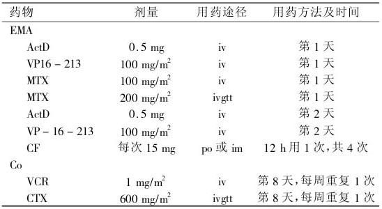 (1)Ⅱ-Ⅲ期: ①ACM三联疗法,疗程间隔2周(表4-5)。 表4-5 绒毛膜上皮癌Ⅱ-Ⅲ期ACM 三联疗法