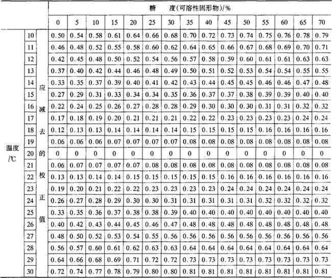 (四)检验方法 1.感官检验 按QB220之二“感官检验”方法进行,缺陷品按表5-2-27分类。 2.营养成分及理化检验 (1)维生素C 维生素C测定按QB869中3.20维生素C测定法检验。缺陷品按表5-2-27分类。 (2)可溶性固形物 可溶性固形物用折光计测定,查附录B折光计读数之温度修正表(补充件)换算。 附录B 折光计读数之温度修正表 (补充件)