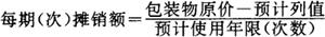 每月根据计算结果会计作摊销处理时,记: 借:经营费用——包装物 300.00 贷:包装物——包装物摊销 300.00 采用分期分次摊销法,也可先确定每期摊销率。其计算公式是: