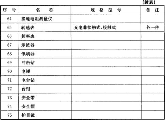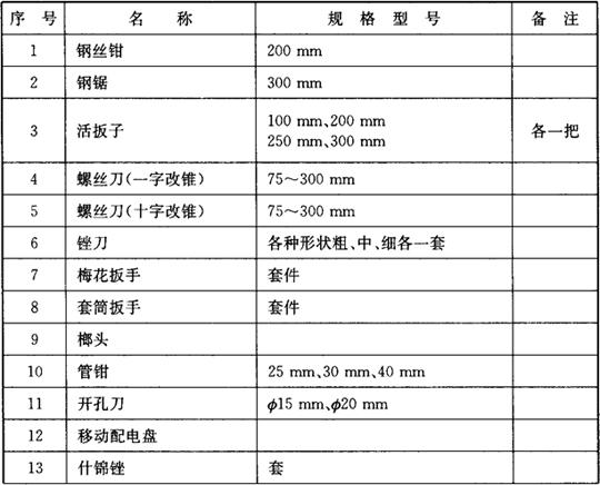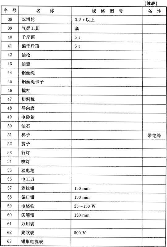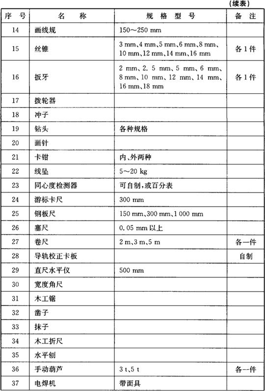 安装电梯需要的工具较多,根据电梯型号、结构的不同,使用的工具也不相同。表3.2-1列出比较通用的电梯安装常用工具清单,可以作为施工前工具准备的参考。