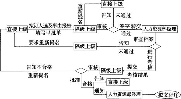 说明: 1.员工任命的原则是逐级提名,隔级批准,人力资源部进行档案审查和组织考核。 2.本程序中直接上级、隔级上级是相对于被任命人而言。 3.任命部门主管级(含)以上管理人员和高级职员,人力资源部须行文任命。 |