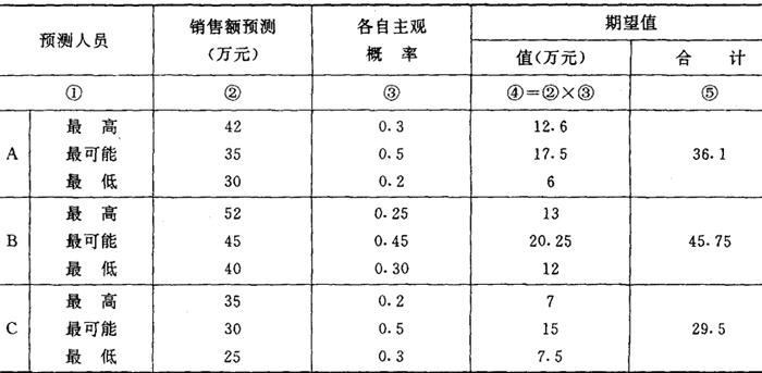 式中Ei(i=1,2……i)是“经验”样本空间的某一事件。 主观概率法可以确切地反映人对未来事件的直觉判断与信任程度。对多人的主观概率,可以取其平均值。 四、集合意见法 以上三种方法,都各有优缺点,如何更有效地发挥各类营销人员、各种技术专家及厂长、经理们的作用,使预定预报工作质量更高呢?就出现了集合意见法。集合意见法类似我国经常提倡与应用的“三结合小组”的方法。集合意见法强调集各种各类人员、各行各业专家(技术的、经营管理方面的)意见,做到取长补短,以收集思广益、相互补充之效,提高预测水平。 (一)集合意见法实施步骤 第一、由领导提出课题、确定本次预测预报的目的、目标、要求、内容、期限;按不同课召集有关的计划、技术、销售、供应、财会人员开会,研究课题及为完成这一预测预报的有关方法、手段,明确各自的任务及要求。第二,各自进行有关资料的搜集、整理、归纳、分析等,再提出预测预报的意见、看法;在这一过程中,有关人员要相互交换情报、互通信息、尽量使自己的看法、建议、意见符合客观实际。第三,由企业领导召集会议,集合有关意见,作出预测预报。 (二)预测人员的任务 1、计划及统计人员、生产管理人员 计划人员要提供有关领导机关所下达的经济发展趋势、长期计划、方针政策、国民经济发展纲要;领导部门及有关统计、银行等机关发布的预测、预报、统计资料及分析;主管部门对本企业发展方向的建议、具体要求、指令性及指导性计划;本企业的长期经营计划、综合平衡资料、生产能力、计划部门对关事件的预测。生产管理人员对企业生产结构、生产能力、T生产力平衡、资源能源、生产技术准备能力等方面提出意见。 2、“信息-决策”体系及“参谋-决策”体系的参谋、情报、咨询人员及对策方案提供人员。 3、销售人员 包括本企业从事市场、营销的销售系统的有关联营、联销、代销等部门的负责人及本企业门市、各分支机构的负责人。这些人员主要负责提供市场、产品、价格、用户、竞争结构及特点的有关资料及分析,各期市场预测、市场占有率、市场供求变化的历史资料;各自对预测项目的意见及预测。 4、科技人员 主要提供技术发展趋势、本企业新产品的地位、作用、发展趋势、竞争能力、技术能力、质量水平、设备适应程度等。 5、供应人员 主要提供物资、能源的保证程度、节约可能、价值分析等资料。 6、财会人员 主要就目标利润、新产品目标利润、新产品目标成本等方面的试算平衡资料及要求;奖金保证程度等。 (三)组织领导 对人员组织可采取矩阵式组织结构,人员按照每次不同的预测预报要求,组织不同的专业人员参加,不必固定,一般也可以不脱产或半脱产。即可发挥各自特长,又可由参与人员沟通情报、发动本部门同志参与预测,形成预测预报网络,有利于调动各类人员的积极性、发挥各种专家及工作人员的作用。 企业应用这一方法,可在开展全员经营及目标管理中,动员与支持职工成立业余的有关“市场预测预报研究小组”,培养、鼓励、关怀有志之士,使搞好企业预测预报成为群众自觉的行动;也可考虑把已形成队伍的技术经济情报(组、室)的力量与经济情报结合起来成立“技术经济情报”组织,鼓励技术情报人员学经济、使技术为经济服务、使技术经济进一步紧密配合,这对全面开创社会主义现代化建设新局面是有益的。 六、判断分析法 在以上几种定性方法中,常常结合判断分析法对不同的销售人员、不同专业人员或领导的意见,进行综合观察、平衡。具体步骤如下: (一)请有关人员对销售额作出预测,如图表3-2所示。 图表3-2 判断法销售预测计算表