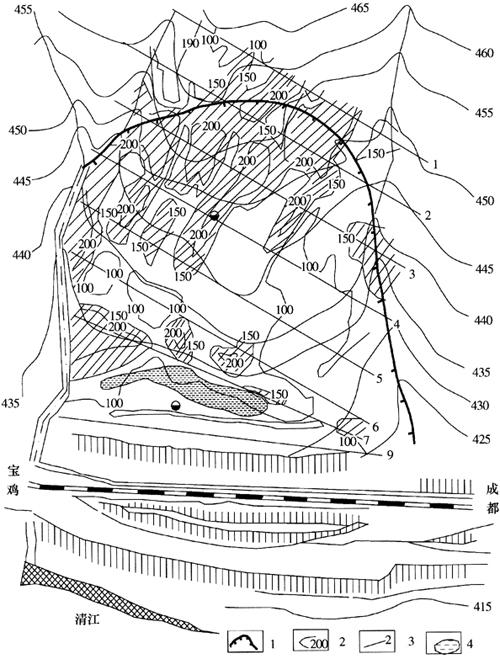 | 释义 | 宝成铁路塔坝滑坡放射性调查 宝成铁路四川塔坝滑坡面积约500×200m2,为规模较大的堆积层老滑坡区,覆盖层厚15~20m,基岩中砾岩、砂岩破碎,页岩、泥灰岩风化严重,裂隙密集,地下水丰富。在地质勘查的基础上,以静电α卡测量为主,配合甚低频电法,测线方向与导水构造方向近于垂直,线距20~25m,点距5~10m。地形向南西方向倾斜。静电α卡测量等值线图,如图2-8所示。大于150脉冲/5min的高值异常汇聚在滑坡的前缘,圈定了滑坡范围。该异常带集中在南北向断层破碎带的西侧边缘,该带裂隙被泥质物充填,地下水至此转向北径流。用甚低频对比验证,两者接近于吻合。测线上钻孔资料证明,地表覆盖层厚16m,主要为砂质粘土的碎石。以上说明静电α卡测量滑坡效果良好,反应了滑坡界面和地下水分布,为排水整治滑坡工程提供了设计依据(金培杰等,1992)。