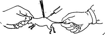 图3-13 家兔耳部静脉注射方法 豚鼠:豚鼠静脉注射比较困难。一般于后肢外侧静脉注射。该静脉上部比较明显,但很活动不易注入。在接近趾部处不太明显,但比较固定,故较易注入。也可将皮肤切开,使静脉露出后注射。或采用心脏内注射(见心脏采血法)。豚鼠静脉注射量不超过2ml。 小白鼠:于尾部静脉注射。用15~20g的小白鼠较易注射。20g以上的小白鼠不易观察静脉,可将尾部浸入50℃温水中泡1min,则血管扩张便于注射。注射时可将小白鼠放入铁丝筐内,将鼠尾从筐孔中拉出,也可用烧杯将小白鼠盖住,将鼠尾从杯口拉出,拉直,从靠近尾的尖端处平行刺入,再向下刺入静脉,注入量不超过1ml。 八、颅腔内注射法 家兔和豚鼠:注射部位在两眼外眦的连接线上,离颅骨正中线约2mm处,注入量约为0.05ml。注射时由助手握紧两耳,将动物按在桌上,并用手指将注部皮肤拉往旁侧按紧,用锥子钻穿颅骨及注射(图3-14),这样可使皮肤的伤口不在注射点之上,而在注射点的旁边,使注部的钻孔不暴露在伤口中,而被掩盖在皮肤下,以减少污染的可能。注射速度一定要慢,避免引起颅内压急骤升高,注射后用碘酒消毒,并用火棉胶将伤口封闭。