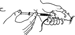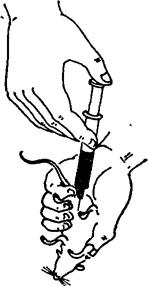 图3-15 小白鼠颅内注射法 九、鼻内接种法 根据接种病原微生物的种毒,必要时动物需先用乙醚麻醉。大动物用麻醉口罩进行麻醉,小动物可放于有盖的玻璃缸内,缸内放浸有乙醚的脱脂棉,使动物达到麻醉。动物麻醉后,用滴管将接种材料慢慢滴入鼻内。如动物处于深麻状态,则能将接种材料吸入肺内。深麻醉的动物易发生肺水肿,大部分在接种后一天内死亡。还需注意,轻度麻醉的动物企图将接种材料喷出。因此进行此项接种时,术者应戴口罩并隔保护玻璃操作、鼠内接种量不可过大,小鼠接种量为0.03~0.05ml,家兔可达2ml。 |
