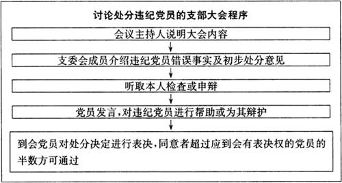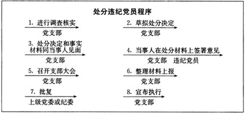 | 释义 | 审理案件工作程序 (1)基层党组织处理违纪案件的工作程序: 处理违纪案件,对党员的纪律处分,必须经过支部大会讨论决定,报上级党委批准;如果涉及的问题比较重要或复杂,或给党员以开除党籍的处分,应分别不同情况,报县级或县级以上纪委审查批准。 ①调查核实,草拟处分决定。党支部对违纪党员所犯错误的事实,除上级纪委转来已有结论的调查材料外,要认真进行调查研究,反复核实无误后,形成调查报告。然后,召开支部委员会,提出处分的初步意见,并草拟好处分决定。 ②处分决定和所依据的事实材料同本人见面。在召开支部大会之前,支委会应将所要做出的处分决定和所依据的事实材料同本人见面,听取本人的说明和申辩。这里所说的事实材料,不包括调查报告、揭发检举材料、证明材料。见面工作需两个人以上,并做好记录。见面后,当事人应在材料上签署意见,如本人有不同意见或拒不签字,负责见面工作的同志应作出书面说明。 ③召开支部大会表决。对党员的纪律处分,除特殊情况外,一般都必须经过支部大会讨论决定。其程序大致是:介绍违纪事实和调查结果;听取本人检查和申辩;党员讨论,对违纪党员进行帮助或为其辩护;支部委员会提出初步处理意见;表决做出决定。进行表决时,同意者超过应到会有表决权的党员的半数,方可通过处分表决,受处分者本人也可以投赞成票或反对票。 ④材料整理上报。处分决定形成后,应交由受处分党员在处分决定上签署意见,本人拒绝签字的,党支部应注明。上报的材料,一般应包括:处分决定;调查报告;证据材料;本人检查材料;本人对处分决定的意见及其他有关材料。必须按规定的审批权限上报。 ⑤宣布执行,通知本人。支部大会通过的处分决定,在上级党委或纪委批准之日生效。党支部接到批复后,应通知本人并在支部大会上宣布。如果本人不服,可以提出申诉,党支部应及时向有关党组织转递;如本人无理取闹,党支部应对其进行批评教育。 附图表1: