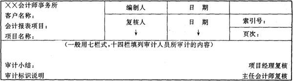(4)审计工作小结。 (5)总体审计计划。 (6)管理建议书。 (7)其他。如审计业务约定书、对被审单位的内部制度的评价,时间、费用预算等。 2.业务类工作底稿。 该类工作底稿是指注册会计师在审计程序及其实施过程中所编制的工作底稿。这类工作底稿主要包括对会计报表实施具体程序的记录和资料以及执行分析性复核的记录和资料,它包含实施审计阶段所收集的全部审计证据,如现金的清点记录、存货的盘点记录、应收帐款的函证情况等等。这类工作底稿为出具审计报告提供基础。 这类工作底稿包括的内容及其排列顺序取决于不同会计师事务所所采用的不同的审计模式。即按报表项目进行审计,还是按经济业务的循环进行审计。 按会计报表项目进行审计的程序是先审计资产负债表,其次是损益表、财务状况变动表以及其他表。审计每一张报表时,应按报表要素的顺序进行。因此,工作底稿的归类参照审计程序的先后合理放置。 按经济业务的循环审计是指将企业的经济业务分成不同的循环,如:销售循环、生产和服务循环、财务循环以及管理循环等。注册会计师以不同循环为核心进行审计,因此,注册会计师在审计时,对所收集的工作底稿也要按照各循环归类。 一般来说,按会计报表项目进行审计,使审计工作全面而不易漏项,但容易重复。目前我国绝大多数的会计师事务所采用这种方法。按经济业务循环进行审计时,审计工作不重复,但易漏项。 3.综合类工作底稿。 该类工作底稿是指注册会计师在审计过程中取得的,对以后年度的审计工作具有备查作用的工作底稿。如被审计单位设立的有关法律文件;企业批准设立的证书、营业执照、合同、协议、章程等文件及其变更文件的复印件;被审计单位组织结构及管理人员结构等相关资料等等。 (二)工作底稿按使用期间的长短又可分为永久性档案和一般档案。 注册会计师在审计工作中应对其所收集的工作底稿进行分类整理,形成审计档案 1.永久性档案。 永久性档案是指那些记录内容稳定,具有长期使用价值,并对以后审计工作具有重要影响和直接作用的审计工作底稿。它一般包括: (1)客户经营资料和经营展望,客户行业的财务资料; (2)主要协议、合同、公司章程、联营合同、营业执照; (3)长期经营策略及预算; (4)长期审计计划,如不同年度的审计计划,有关存货盘点地点计划等; (5)向客户提供的管理建议书以及审计报告的附本等等。 永久使用的工作底稿并非一成不变,它应每年进行更新,将过期无效的文件取出,并增加有关的新资料。 2.一般档案。 它是指那些内容经常变化,只供当期使用和下期参考的审计工作底稿。业务类工作底稿一般来说就属于这一类档案。 三、工作底稿的编制和索引 (一)工作底稿的基本要求 对编制工作底稿的基本要求是:要素齐全,格式规范,标示一致,记录清晰,结论明确。 1.“格式规范”是指工作底稿既要符合独立审计准则的有关要求,也要符合会计师事务所内部制度的规定。一个好的会计师事务所都应有自己内部规范的工作底稿格式,以便于审核、培训新职员以及材料的装订。注册会计师编制的审计工作底稿应包括以下基本要素:被审计单位名称标示及其说明、具体审计事项的名称、审计项目的时点和期间、审计过程记录、审计标示及其说明、审计结论、索引号及页次、编制者及复核者的姓名、日期等等。工作底稿的通用格式参见如下(见表3-3): 表3-3
