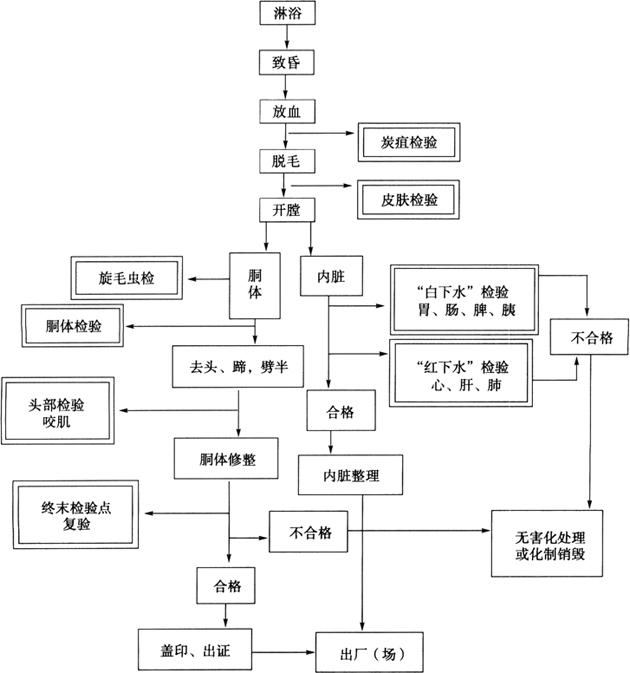 | 释义 | 宰后检验的组织方法和技术要求 (一)宰后兽医检验点的设置与同步检查方法 宰后检验点的设置是根据屠畜的种类,对畜产品的卫生要求及生产加工工艺和兽医检验技术条件与技术水平来设置的。在我国现有的工艺设备与技术条件下,在有自动或半自动传送装置的屠宰企业中,宰后兽医卫生检验点的设置图示如图5-1-2所示。
