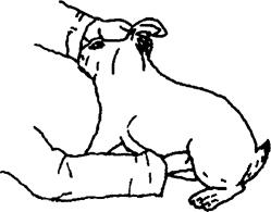 图5 摸胎方法 操作时将母兔平放到地上,左手抓住兔耳和颈部皮肤,右手拇指和其他四指呈八字形伸向母兔腹下大腿内侧,五指轻轻靠拢摸捏,即可摸到有弹性而滑动的肉球(胎儿)。 注意不要在刚喂饱时摸胎。摸胎时动作要轻,不要硬抓,以免引起流产。 |