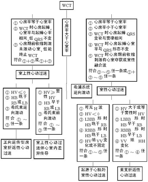 图2-19-2 WCT鉴别流程图 (四) VT与旁道前传SVT鉴别 Brugada四步鉴别法不适用与房室附加束前传性SVT与室速的鉴别,按照Brugada四步鉴别法极可能将房室附加束前传性SVT误诊为VT。故凡符合VT标准的WCT,从QRS波形态不能完全排除旁道前传性SVT者,需进行鉴别。 1.胸前导联主波方向 左侧旁道前传时V4~V6导联主波向上,右侧旁道前传时V1~V6导联主波均向上,若胸前导联主波以负向波为主可排除旁道前传SVT。 2.房室分离 可排除旁道前传SVT。 3.QRS波形态 无器质性心脏病患者V2~V6导联QRS出现QR形态可排除旁道前传SVT。 4.电轴 电轴极度右偏时可排除旁道前传SVT。 5.预激波 窦性心律时有无预激波形可有助于鉴别,但必须除外Mahaim纤维及预激程度较轻者。 (五) 束支折返性室性心动过速 1.额面电轴可以左偏也可以右偏。 2.QRS波可呈典型的LBBB或RBBB图形。 3. QRS波常≤120ms,很少达到或超过140ms。 4.房室分离。 5.发生室性融合波QRS形态正常或接近正常。 6.静脉注射维拉帕米或普罗帕酮可使部分患者心动过速终止,而利多卡因多无效。 (六) WCT电生理鉴别对于心电图不能明确诊断者需行电生理检查以进一步确诊。 |