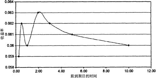 图25.4 HFRI可转债套利指数 固定收益套利对冲基金 固定收益套利牵涉到购买一种固定收益证券,并同时出售一种相似的固定收益证券。出售第二种证券的目的是为了对冲第一种证券所内含的基础市场风险。通常,这两种证券在数学上或经济上相关,从而具有相似的市场价格走势。一般而言,这两种证券的定价差异很小,而这正是固定收益套利者希望获取的利润。通过购买和出售两种联系在一起的固定收益证券,对冲基金经理希望捕捉将会导致两种证券的价格逐渐趋同的定价差异。 固定收益套利不需要利用异型证券。它可以只是购买和出售美国财政债券。在债券市场中,最具流动性的证券为新上市财政债券。它们是美国财政部最新发行的债券。然而,市场中还有特征与新上市财政债券十分相似的其他未偿美国财政债券。它们的区别在于:落市债券是先前发行的,其当前的流动性不如新上市的债券。因此,价格差异将会产生。价格差别可能只是半个或四分之一个基点(25美元),但可能会在投资者的资金转向流动性最佳的美国财政债券的动荡时期上升。 尽管如此,当这两种债券被持有到期时,其价格应会趋向于票面值。所有差异都会在其到期时消除,对冲基金经理可以捕捉所有的价格差异。固定收益套利不仅限于美国财政债券市场。它还可被应用于公司债券、市政债券、主权债券或房产抵押贷款支持证券。 固定收益套利还可以包含到期日相近的固定收益证券的交易。这是收益曲线套利的一种形式。这类交易通常是由期限结构的暂时失衡驱动的。 让我们考虑图25.5。这是2000年7月的美国财政债券期限结构。注意,期限结构在3个月至5年的时间范围内存在弯曲。收益曲线上的弯曲可以在任何期限发生,它们通常反映了在弯曲点前后的流动性需求的上升(或下降)。这些弯曲提供了通过购买和出售期限相似的财政证券获利的机会。
