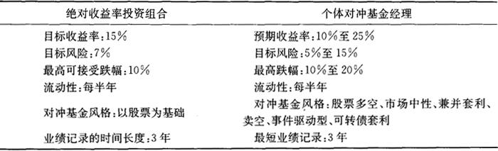 对冲基金之基金 对冲基金之基金是对一组对冲基金(5至20多只)的投资。对冲基金之基金的目的是降低单个对冲基金经理的特殊风险。换言之,多则安全。这不过是将现代投资组合理论(MPT)应用于对冲基金市场。多元化是MPT的基础原理,它不仅适用于股票和债券,而且同样也适用于对冲基金。 合资基金 正如我们在引言中指出的那样,对冲基金市场较为分散,大多数对冲基金经理都仅控制规模较小的资产。这提供了与新兴对冲基金经理建立合资基金的良机。 任何新对冲基金经理面临的最大挑战都是吸引足够的资本以达到临界规模。Park、Brown与Goetzmann发现对冲基金的淘汰率大约为每年15%,而Brown、Goertzmann与 Ibbotson则发现只有极少对冲基金的存续时间在3年以上。(8)大型机构投资者可以在提供必需资本的同时,提供为达到这个临界规模所需的稳定性和可信度。在这种情形中,对冲基金经理获取的好处要远远大于其收取的费用。 作为提供这些启动好处的回报,机构投资者可以要求降低费用或分享经理的收入。随着对冲基金经理增加其管理的资产规模,机构投资者将会分享这种增长。此外,机构投资者还可以较低的费用结构在其对冲基金投资上赚取高额回报。这种形式的合作可以同时为机构投资者和对冲基金经理带来良好的长期回报。 对冲基金市场的另一项新发展是对冲基金管理公司。它们是通过收购对冲基金经理的股权将一群对冲基金经理聚集起来的资产管理公司。这个商业模式与传统基金经理建立共同基金公司的模式相似。 在共同基金行业中,每家共同基金都各自会建立一家为其提供咨询的公司。投资顾问在证券交易委员会注册共同基金公司、向投资者出售共同基金股份,并履行所有必要的会计和运营职责。从为共同基金提供投资咨询赚取的费用归顾问公司所有。 同样,对冲基金管理公司为对冲基金经理处理所有的监管、运营和营销问题,并作为回报,分享对冲基金经理赚取的管理费和利润分享费。这些对冲基金管理公司出于两个原因需要投资资本。 首先,它们需要运营资本以为其管理公司收购对冲基金经理。其次,它们需要投资资本以交给其对冲基金经理。作为回报,投资者可以获取对冲基金管理公司或个体对冲基金经理的股份,并获取对冲基金投资的好处。 这个策略是私募股权与对冲基金投资的组合,它具有数个好处。首先,许多机构投资者都雇有私募股权工作人员。利用这些工作人员进入非常规资产领域的新竞技场使机构投资者能够将其投资经验应用于一个新的天地。这种“可转移专业知识”与可转移阿尔法相似,因为它可以被加入非常规资产市场的其他投资渠道。 其次,私募股权投资通常被设计为基金或集合。这个法律结构与对冲基金的结构相似(但不完全相同)。(9)因此,私募股权投资者通常在处理非常规资产领域的集合投资者的问题方面拥有丰富经验。 最后,私募股权投资与对冲基金投资的联系是非常规资产投资的自然演变。投资者不一定必须通过选择独立的非常规资产才能实现投资机会的扩大;非常规资产的组合也同样有效。 绝对收益率 对冲基金通常被描述为“绝对收益率”产品。这一术语起源于该行业的基于技术的本质。对冲基金经理一般声称其投资收益率来自其选择证券的技术,而不是资产类别的选择。这是由于大多数对冲基金经理都建立由相对较少的投资头寸组成的集中投资组合,而不试图跟踪股指或债券指数。Fung与Hsieh的研究显示,对冲基金生成的收益率分布与共同基金有很大不同。(10) 此外,由于对冲基金经理在不受监管的环境中运作,他们在交易风格和执行上比传统的纯多头经理拥有更大的灵活性。这种灵活性提高了对冲基金经理实现其收益率目标的概率。因此,对冲基金通常被描述为绝对收益率工具,它们有一个特定的年收益率目标,无论市场指数的表现如何。换言之,对冲基金经理的目标是绝对收益率,而不是相对指数判断其业绩。 所有传统的纯多头经理都以某个被动指数为基准。基准参考的性质迫使经理将注意力集中于其基准和与基准相关的跟踪误差。这种对基准参考的注重导致传统的主动型经理将其投资组合的很大部分用于跟踪基准。由于投资经理必须相对指定基准考虑每笔交易对投资组合跟踪误差的影响,他们的灵活性降低了。 此外,纯多头主动型经理卖空证券的能力也受到了限制。他们只能以不高于证券在基准指数中的权重的数量“卖空”证券。假如证券仅是指数的一小部分,那么经理卖空股票的能力将进一步受到限制。由于主动型经理不能超出基准权重卖空证券,因此将不能利用市场中的大量定价错误机会。此外,纯多头经理不仅不能利用定价过高的证券,而且还不能充分利用定价过低的证券,因为他们不能生成用以平衡低价证券的超额权重所需的空头。 对冲基金经理的灵活性使他们能够在不受基准限制的情况下买入和卖空。这使他们能够设定一个目标收益率或“绝对收益率”。 绝对收益率计划必须设定具体参数。这些参数将指导对冲基金计划的构建和运作方式,并应包含风险和收益率目标,以及对冲基金经理可以选择的策略类型。绝对收益率参数应在两个层面发挥作用:个体对冲基金经理和整个对冲基金计划。投资者为每个对冲基金经理设定目标收益率范围,但会为绝对收益率