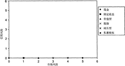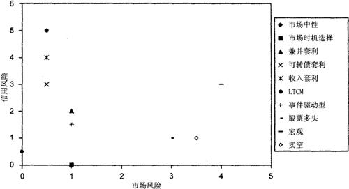 图25.12 纯多头投资 正如图25.12显示的那样,传统的纯多头经理拥有大量的市场风险,但信用风险却极低。在尺度的一端是货币市场现金经理。为了避免蒙受损失,这些经理不冒任何信用风险或市场风险。他们投资于最具流动性和信用资质最高的短期金融票据。通常,这包括优质的90天商业票据和90天美国财政票据。 在尺度的另一端是私募股权投资经理。他们不冒任何信用风险,但拥有最高的市场风险。例如,大多数私募股权基金都有7至10年的锁定期。私募股权基金投资于非上市证券,这些证券没有现成的市场。其流动性很低,投资者受到股票市场的长期前景的影响。 处于现金经理与私募股权投资经理之间并且在市场风险尺度上逐渐上升的是固定收益经理、价值型经理、股指经理和成长型经理。 对冲基金经理的图形分析则有很大不同。图25.13显示了数种主要对冲基金风格的市场风险与信用风险。在零轴附近是市场中性基金——那些无市场风险(市场中性)并且杠杆较低的对冲基金。由于市场中性基金没有市场风险需要利用杠杆放大,因此它们仅利用有限程度的杠杆。